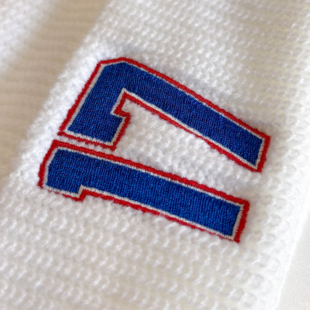 One size fits most. Blue 17 with red outline is embroidered on white 100% acrylic knit fabric.