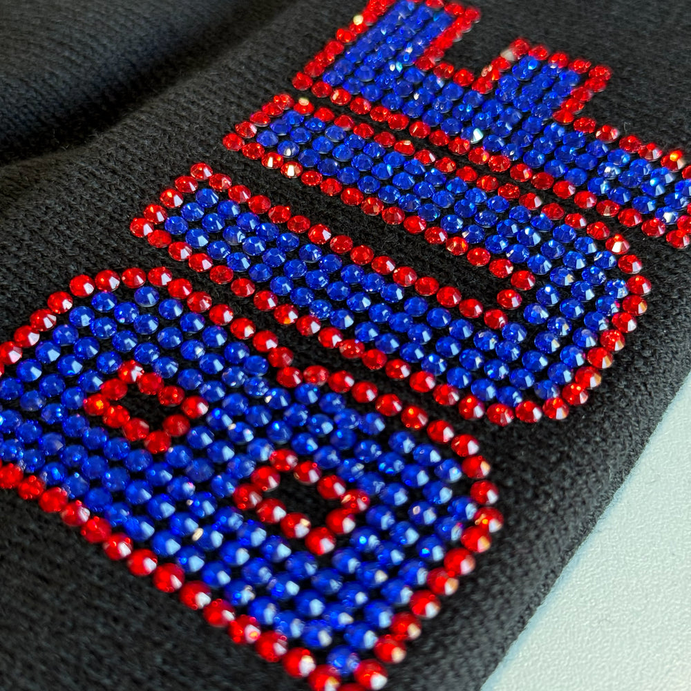 One size fits most. BUF is sparkles bedazzled on black 100% acrylic knit fabric.