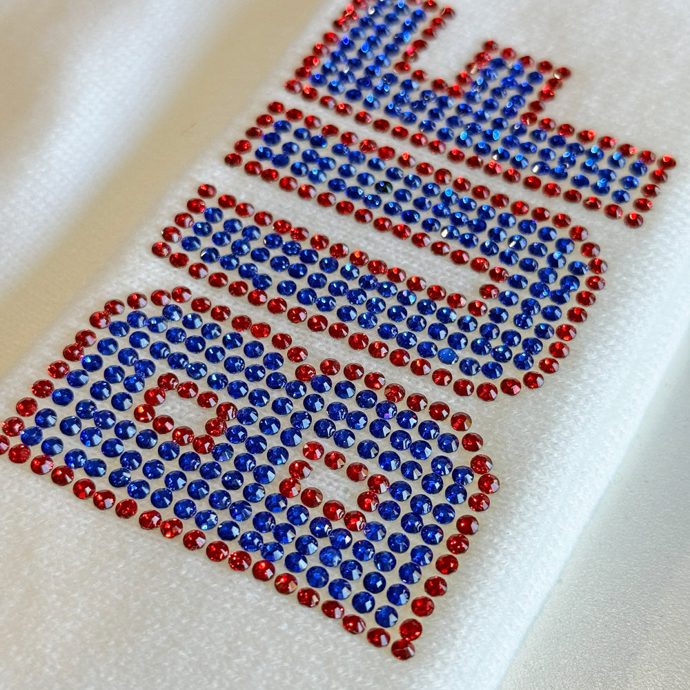 One size fits most. BUF is sparkles bedazzled on white 100% acrylic knit fabric.